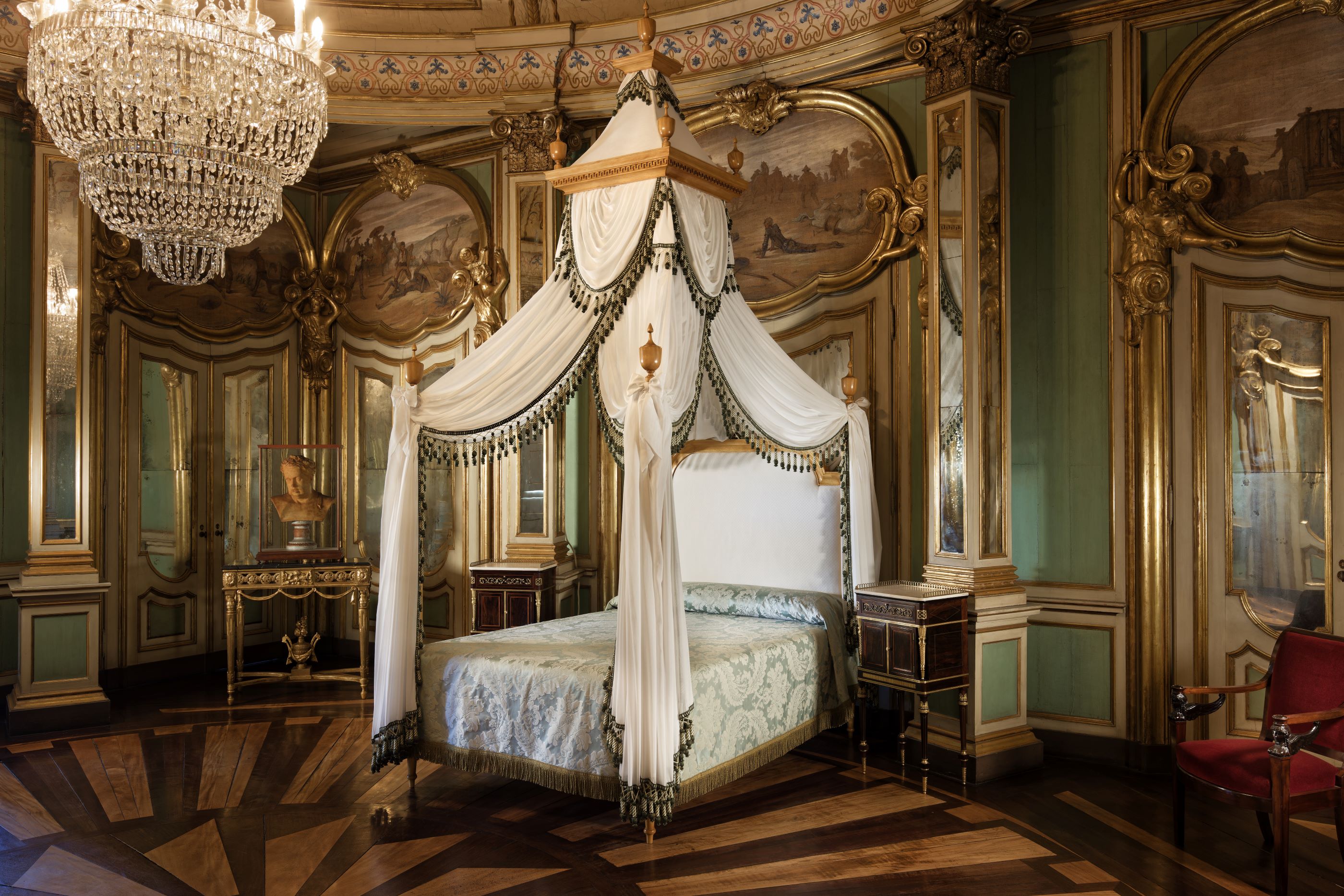 Le lit d’apparat où Pedro IV du Portugal, premier Empereur du Brésil, mourut dans la Salle de Don Quichotte du Palais National de Queluz — salle où ce monarque était né 35 ans auparavant — est bien plus qu’un simple meuble : il incarne la fin de l’Ancien Régime et le commencement du Libéralisme au Portugal. Son retour dans cette salle enrichit le discours muséographique du monument, permettant de lire l’espace comme imprégné de la mémoire d’une figure indissociablement liée à l’histoire du Palais de Queluz, du Portugal et du Brésil.